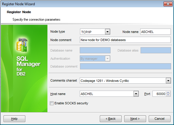 Use this step of the wizard to set the necessary connection parameters for a new Node in the corresponding boxes: Node type, Node name, Node comment, Comments charset and protocol-specific connection properties.