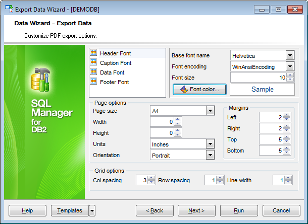 Use the Base font name and Font encoding drop-down lists to select the preferable font (Helvetica, Courier, Times Roman, etc.) and encoding (Standard, WinANSI, MacRoman, PDFDoc) respectively, and the Font size spinner control to specify the font size.