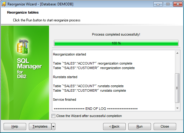 If this option is selected, the wizard is closed automatically when the reorganizing tables process is completed.