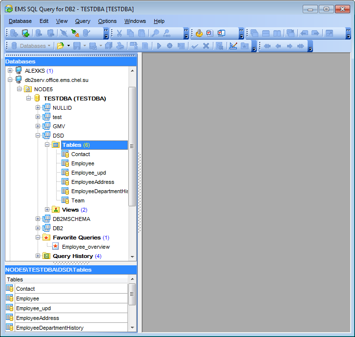 To connect to a database, simply double-click its node (or select the database node in DB Explorer and press Enter). If the connection is successful, the database node expands into a tree of objects. Now you can navigate within the database objects and queries. Use SQL Assistant to get extended information about the currently selected object.