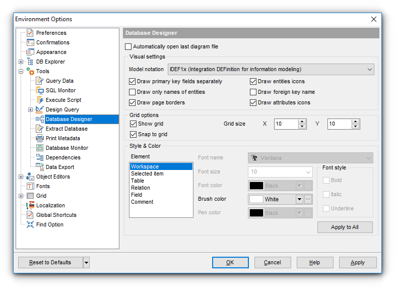 Select the Element type from the list: Workspace, Selected item, Table, Relation, Field, Comment and set the required options for it, including color or font properties. Use the Apply to all button to apply the changes to all elements.