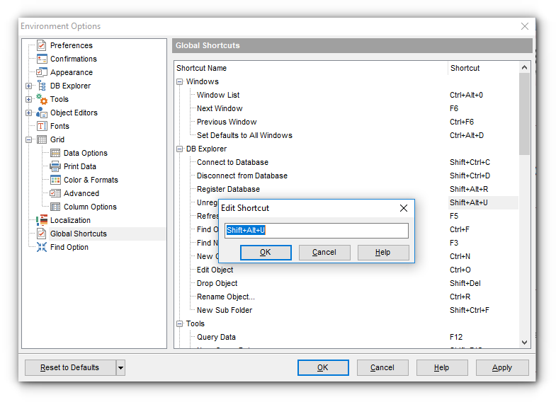 This section allows you to view/edit shortcuts for most needed actions when working with SQL Manager for InterBase/Firebird.