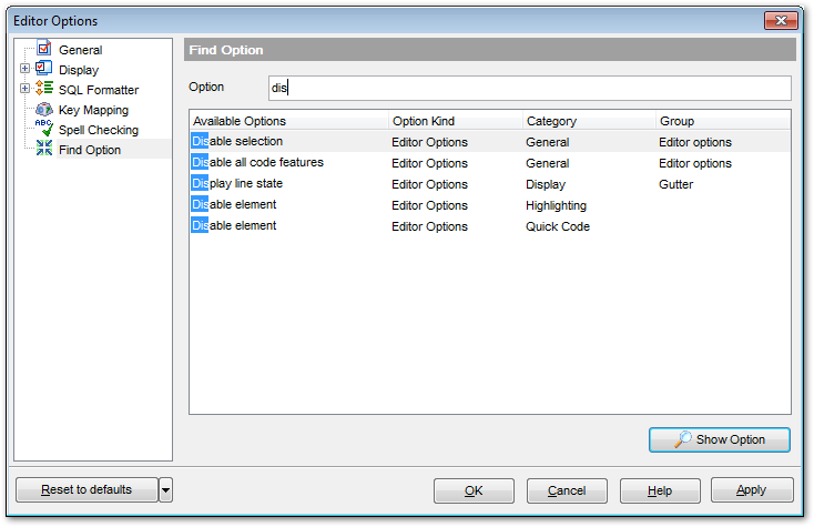 The Find Option section allows you to search for options available within the Editor Options dialog easily and quickly.