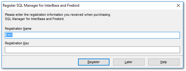 EMS If you have not registered your copy of SQL Manager for InterBase/Firebird yet, you can do it by pressing the Register Now button and entering your registration information in the Register SQL Manager for InterBase/Firebird dialog.