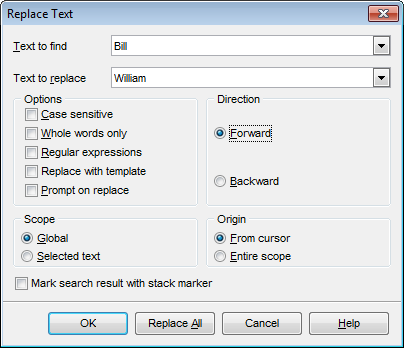 The search and replace process covers either the entire block of selected text or the entire script (no matter where the cursor is in the Editor area) depending upon the Scope options.