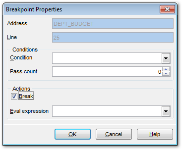 The Breakpoint Properties dialog allows you to view/edit properties for each breakpoint set in the procedure.