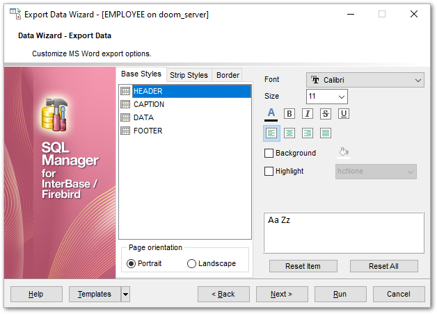 Using the Base Styles tab you can set font options for all elements of the Word 2007 / ODT document (HEADER, CAPTION, DATA, FOOTER). You can customize style options, such as font and size, background and foreground colors, text alignment, text highlight, etc. for each of them by clicking the corresponding item in the list and setting the options in the right-side panel.