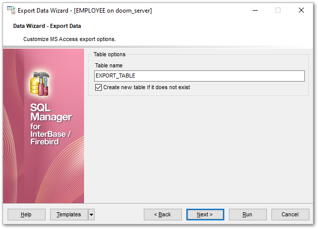 Set the name for the target table and specify whether the wizard should create a new table in the MS Access database if it does not exist yet, or use the existing table to export data into.