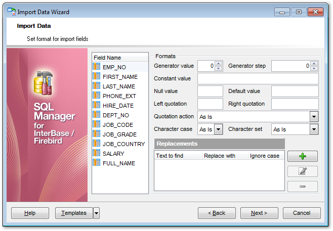 Use the Character set drop-down list to select which charset will be used for string data in the field: ANSI, OEM, or As is.