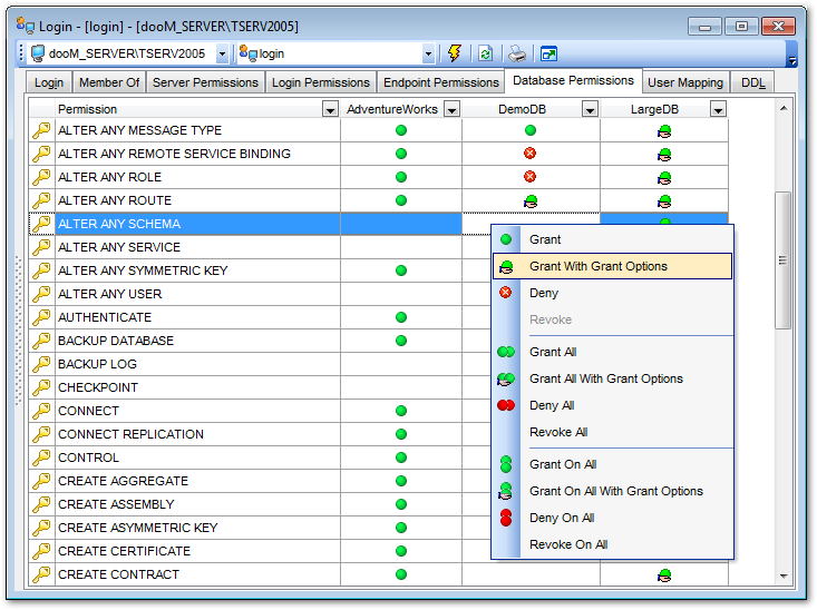 Right-click a cell to grant a specific permission on a certain database that has a user mapped to the login. To grant a permission on a database, you should find the permission in the Permission list and the column with the corresponding database. The context menu of a cell allows you to: