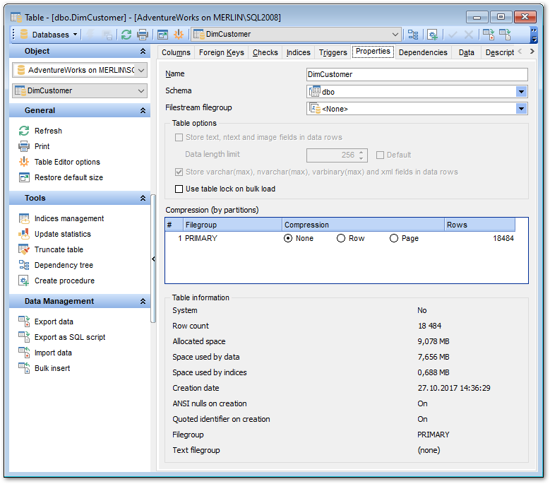 The Table information group allows you to view the table summary: System (Yes/No), Row count, Space used by data, Space used by indices, Creation date, ANSI nulls on creation (On/Off), Quoted identifier on creation (On/Off), File group, Text file group.