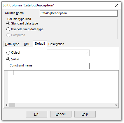 This box allows you to set a name for the constraint which is automatically created when you set a default value for the data column. If you leave this field empty, the constraint will be named by the server.