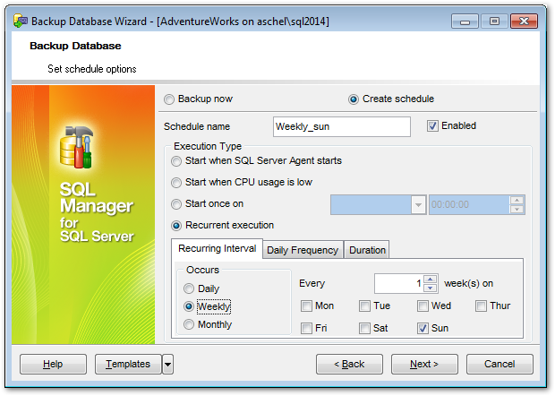 This tab allows you to set the schedule recurrence periodicity in days: you can run your schedule daily, weekly, monthly, every several days, or on a certain day(s) of the week.