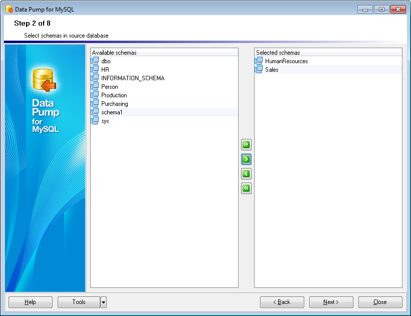 This step of the wizard allows you to specify schemas of the source database to pump objects from.