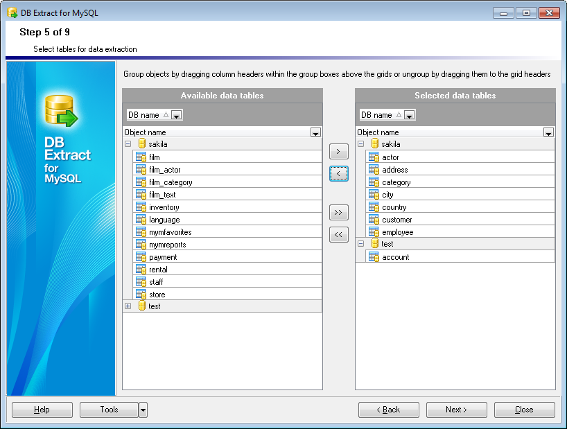 To select tables, move the items from the Available data tables tree to the Selected data tables tree. To cancel table selection, just remove it from the Selected data tables tree. Use the