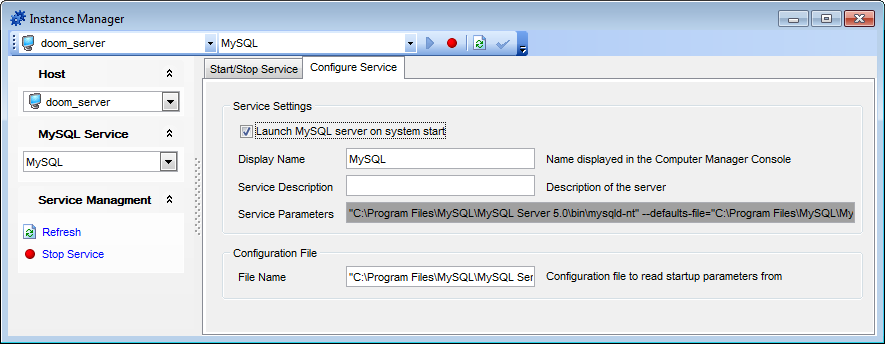 Specify filename and its location. Parameters specified in the file will be used by service.