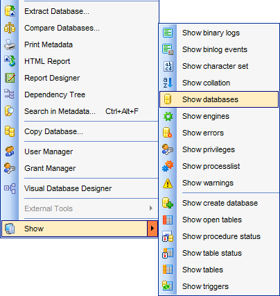 Show information has many forms that provide information about databases, tables, columns, or status information about the server. To access this tool open the main menu Tools | Show submenu and select the needed item. Alternatively you can use the Database Tools |