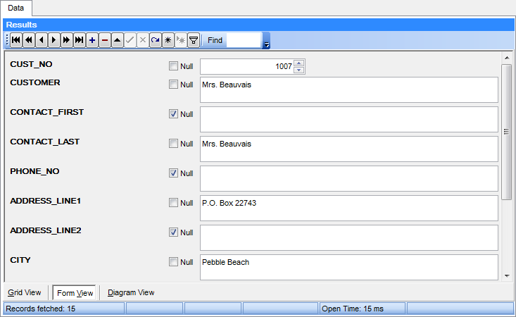 The form displays the current record: field names on the left and the corresponding values on the right. If the fields are available for editing, you can edit the record directly on this form. The navigation pane at the top of the form allows you to browse the data quickly, to insert, update and delete records, and to set a filter for the records using the Filter Builder dialog.