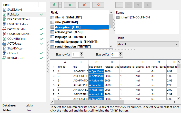 If necessary, you can choose to skip a defined number of the source file rows or columns using the Skip lines or Skip cols spin-edit.