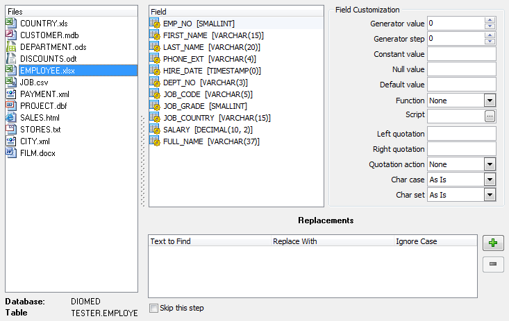 Select a field in the list and use the Field Customization group to adjust format options that will be applied to this field only: generator value, generator step, constant value, NULL value, default value, function, script, left/right quotation, quotation action, character case, character set.