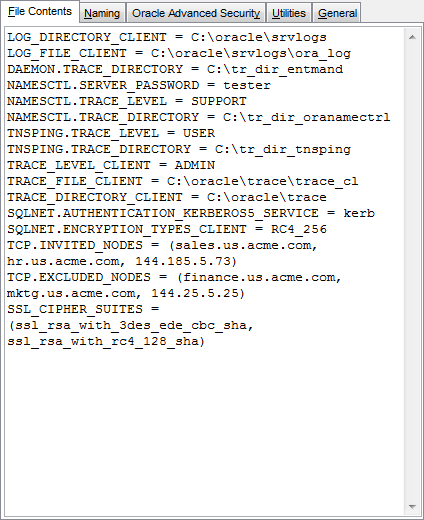 The File Contents tab allows you browse the SQLNET.ORA Network Configuration file contents. If necessary, you can edit the text manually.