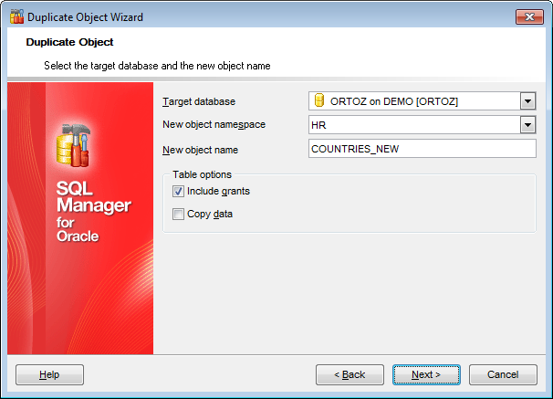 Select the target database and object namespace (schema) to create the new object in, set the name of the new database object.