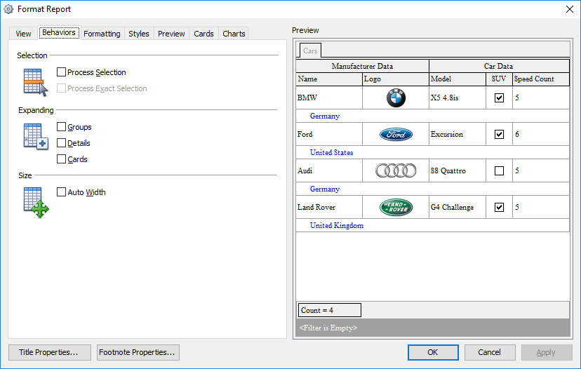 The Behaviors tab of the Format Report dialog allows you to specify the way (behavior) the report elements will appear on the printing form.