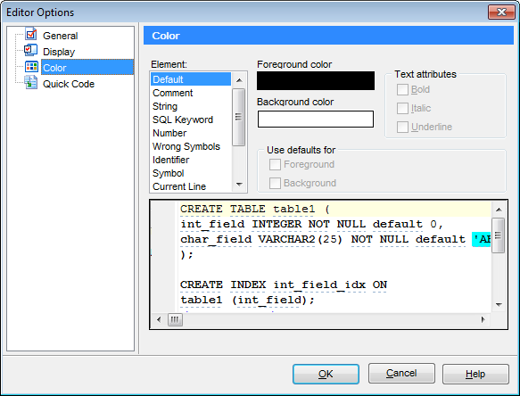 The Color section of the Editor Options dialog you can set the background colors and text attributes (Bold, Italic, Underlined) used by the editor to mark out different text fragments: Default, Comments, Strings, SQL Keywords, Numbers, Wrong Symbols, Identifiers, Symbols, Selected Text, etc.
