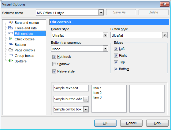 Use these drop-down lists to specify the style around an editor (the edit control borders) and select the painting style that will be applied to the edit control buttons (ellipsis button, arrow-down combo-box button, etc.) respectively: