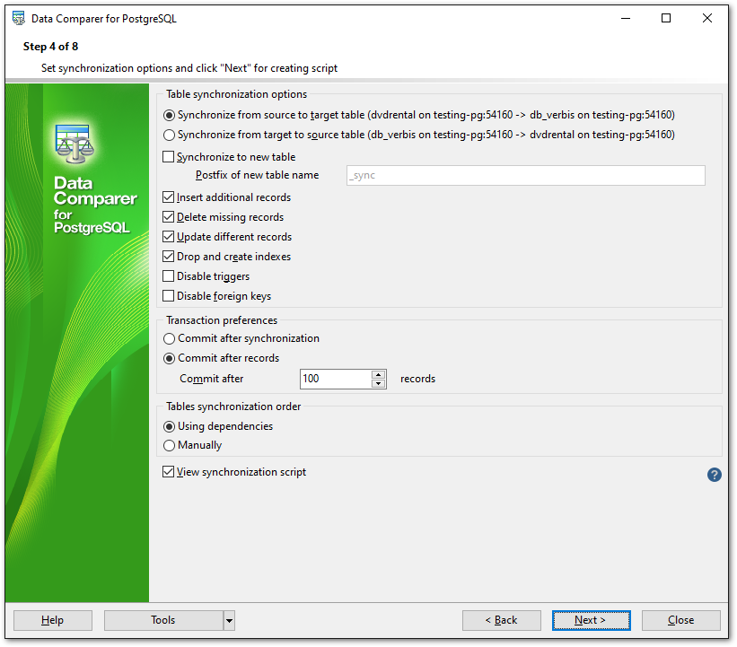 Check this option to create a new table with the synchronization applied. In this case the name of the new table will be composed of the name of the source table and the user-defined postfix (_sync by default).