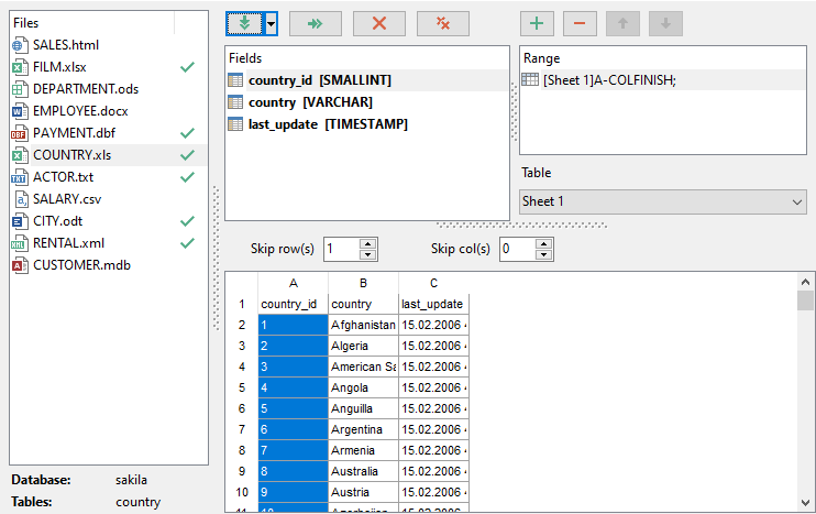 If necessary, you can choose to skip a defined number of the source file columns and/or rows using the Skip Col(s) and Skip Row(s) spin-edits.