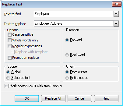 The search and replace process covers either the entire block of selected text or the entire script (no matter where the cursor is in the Editor area) depending upon the Scope options.