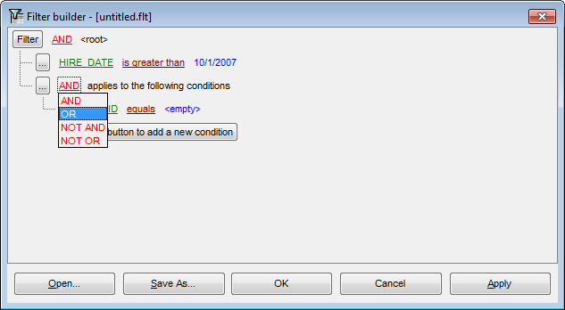 In our case it is enough to click the group operator box and select the AND item from the drop-down menu.