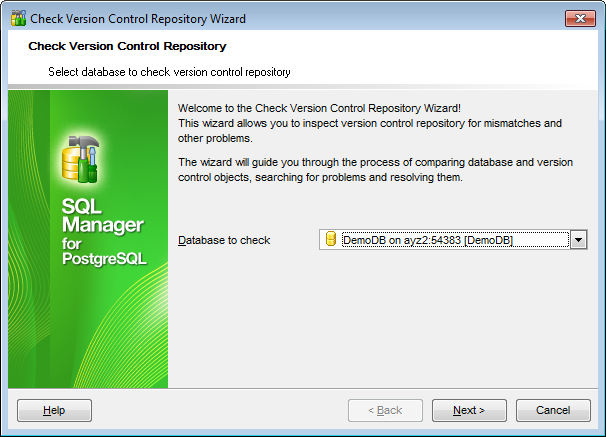 In this step you should select a database to check version control repository. Proceeding to the next step is allowed only if VCS is enabled for the selected database.
