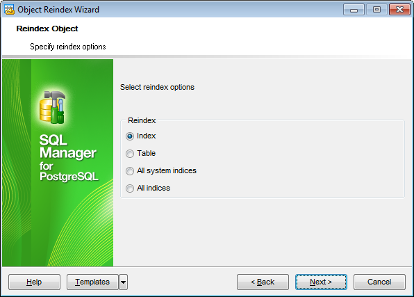Specifies Index as the reindex target object. If selected, you will have to specify the index table using the Table box, and select index(-es) in the appropriate boxes at the next step of the wizard.