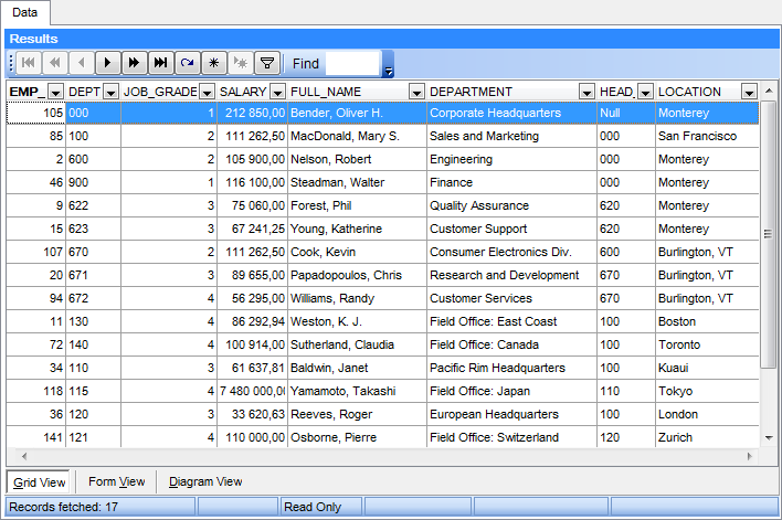 By default, data returned by a query are displayed as a grid. It is indicated by the Grid View tab selected on the View mode panel at the bottom of the Results area of the window.