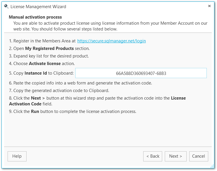- Enter automatically generated Instance ID from the wizard step into a web form and generate the activation code.