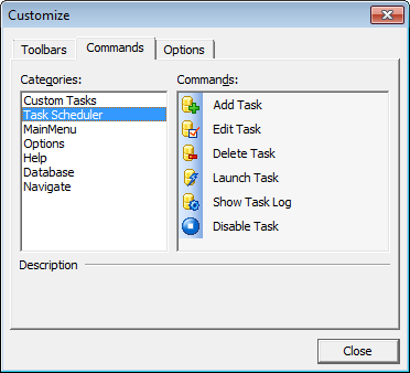 This tab allows you to view the list of all the commands available within toolbars of the parent window. Selecting categories in the Categories list box displays commands of the selected category (e.g. 'Register Database' or 'Unregister Database') in the Commands list box. You can pick a command and drag it onto any parent window toolbar to create a button for this command.